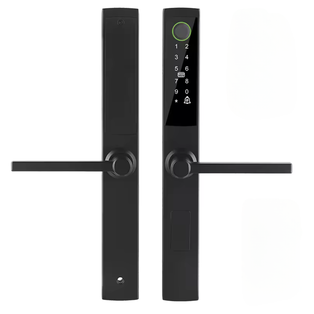 Cerradura inteligente para intemperie. Soporta 5 modos diferentes de apertura. Ideal para ser instalada en puertas exteriores gracias a que sus materiales soportan exposición a la lluvia, sol e intemperie. Esta cerradura puede ser gestionada fácilmente desde el celular utilizando la App Tuya Smart.